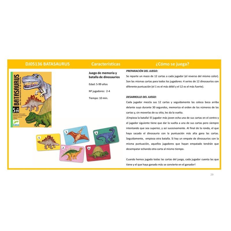 Cartas Batasaur 3070900051362 Cartas Batasaurus -Un juego de memoria en forma de batalla. En lugar de tener las cartas en la mano, las cartas se colocan boca abajo sobre la mesa. ¡Solo se tienen unos segundos para memorizar su lugar antes de que arranque el combate de dinosaurios! 1, 2 y 3: cada jugador le da la vuelta a una de sus cartas y la carta más alta gana la baza. iLos jugadores pueden elegir qué carta usar y ganar la baza, pero para ello deben recordar el lugar que ocupan sus dinosaurios! ¡El jugador que haya ganado más cartas gana la partida! -Hay 12 cartas de dinosaurios para memorizar, con fuerzas numeradas del 1 al 12. -Un juego de batalla inédito que requiere ejercitar la memoria. -llustraciones para descubrir diferentes especies de dinosaurios. -Una caja compacta, que se puede llevar a todas partes. -Cartas de calidad y resistentes.