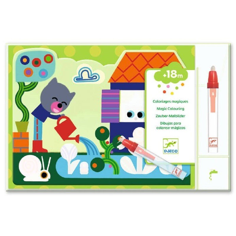 Colorea mágico 3070900090637 Escondido en el jardín -Un pack de acuarelas adecuado para niños a partir de 18 meses. El niño colorea las partes blancas con el lápiz de agua para descubrir lo que se esconde en el cielo. Es mágico: los dibujos aparecen y cambian de color. Las tablas se secan y el niño vuelve a empezar. -Una primera actividad para colorear, a partir de los 18 meses. -¡Efecto mágico! -Un lápiz grande adecuado para manos pequeñas. -1 bandeja rígida para soportar los 4 tableros. -Tablas de plástico para volver a empezar tantas veces como quieras. -Práctica bolsa de almacenamiento, fácil de transportar.